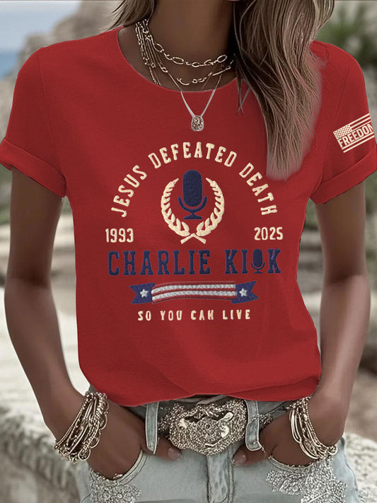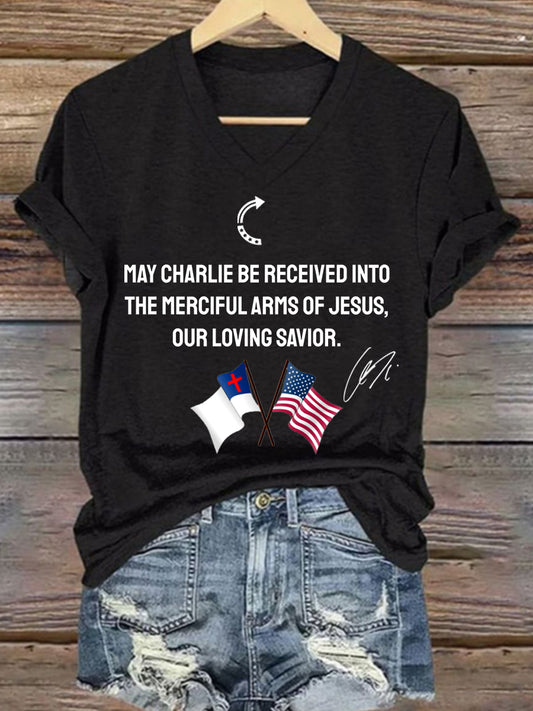 Women's May Charlie be accepted into the compassionate arms of our loving Savior Jesus" Charlie Kirk signed commemorative T-shirt