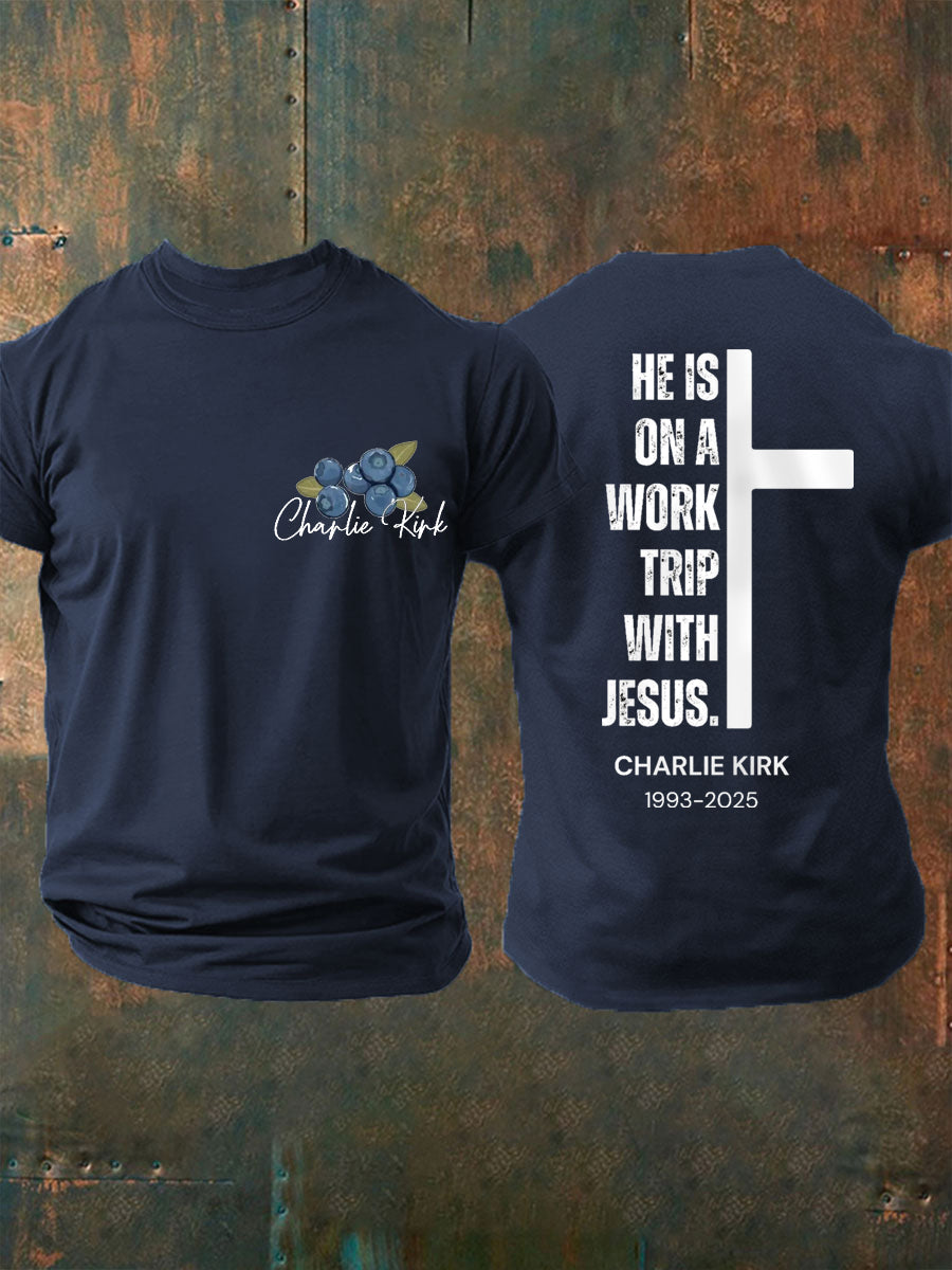 Men's He's On A Work Trip With Jesus Faith Based Inspired By Erika Kirk, Pray For Charlie Kirk Tee