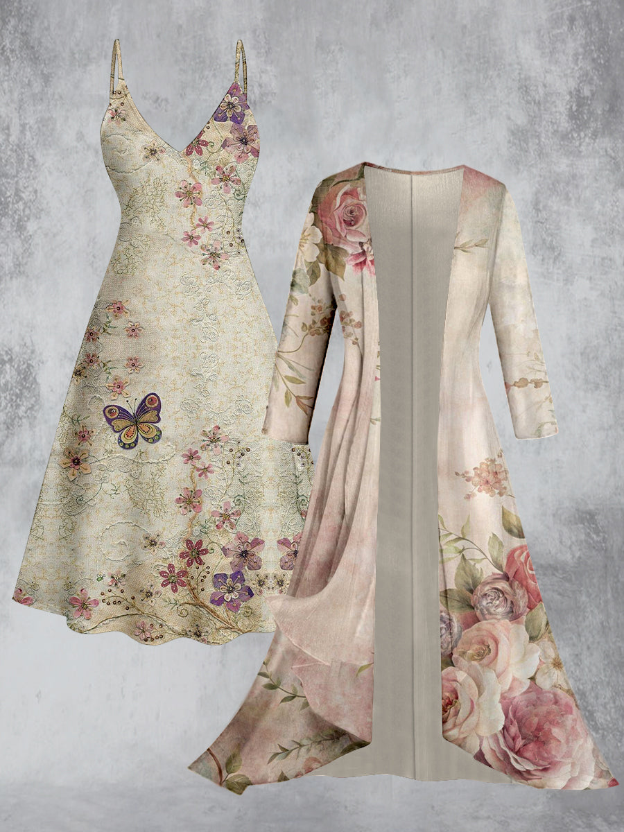 Retro Floral Art Printed Vintage Camisole Dress Long Sleeve Two-Piece Midi Dress