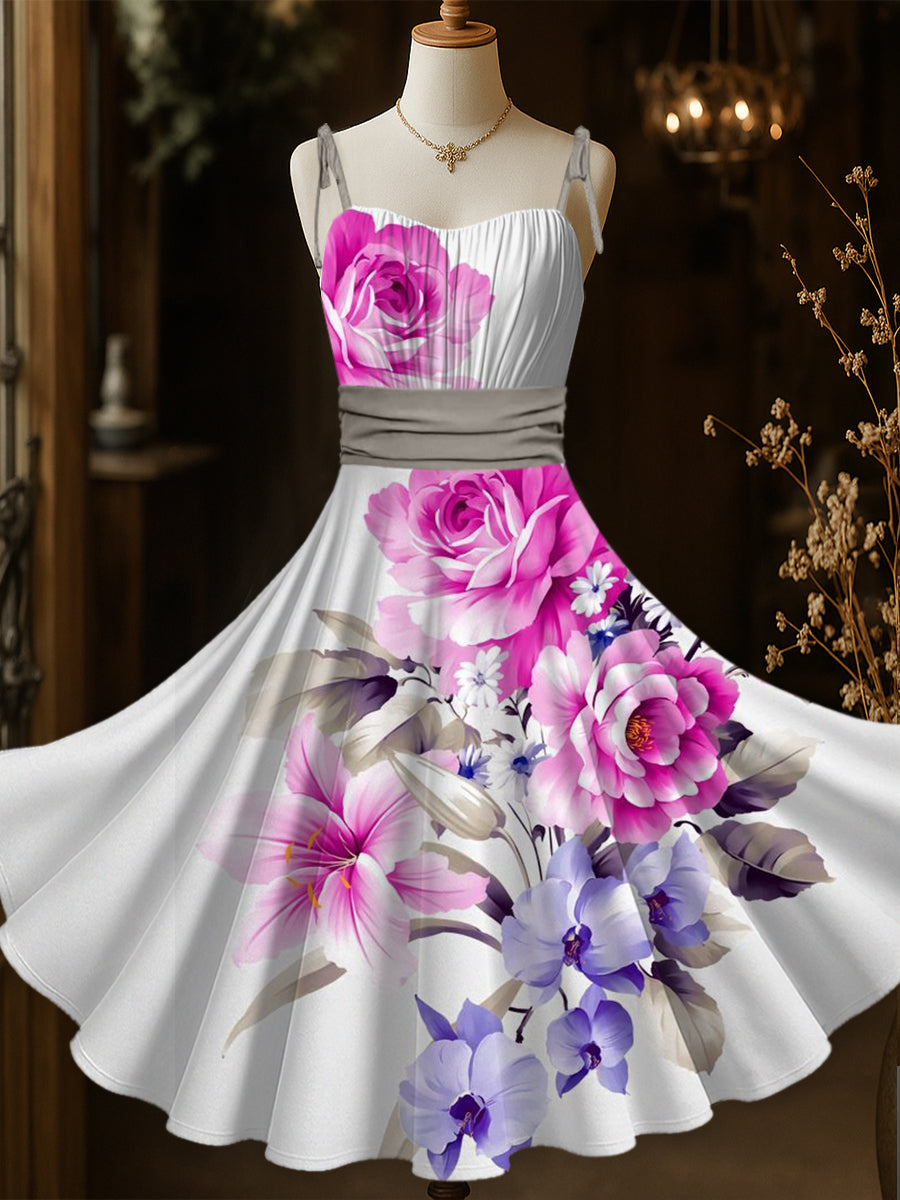 Retro Floral Art Printed Vintage Chic Pleated Waist Slip Midi Dress