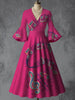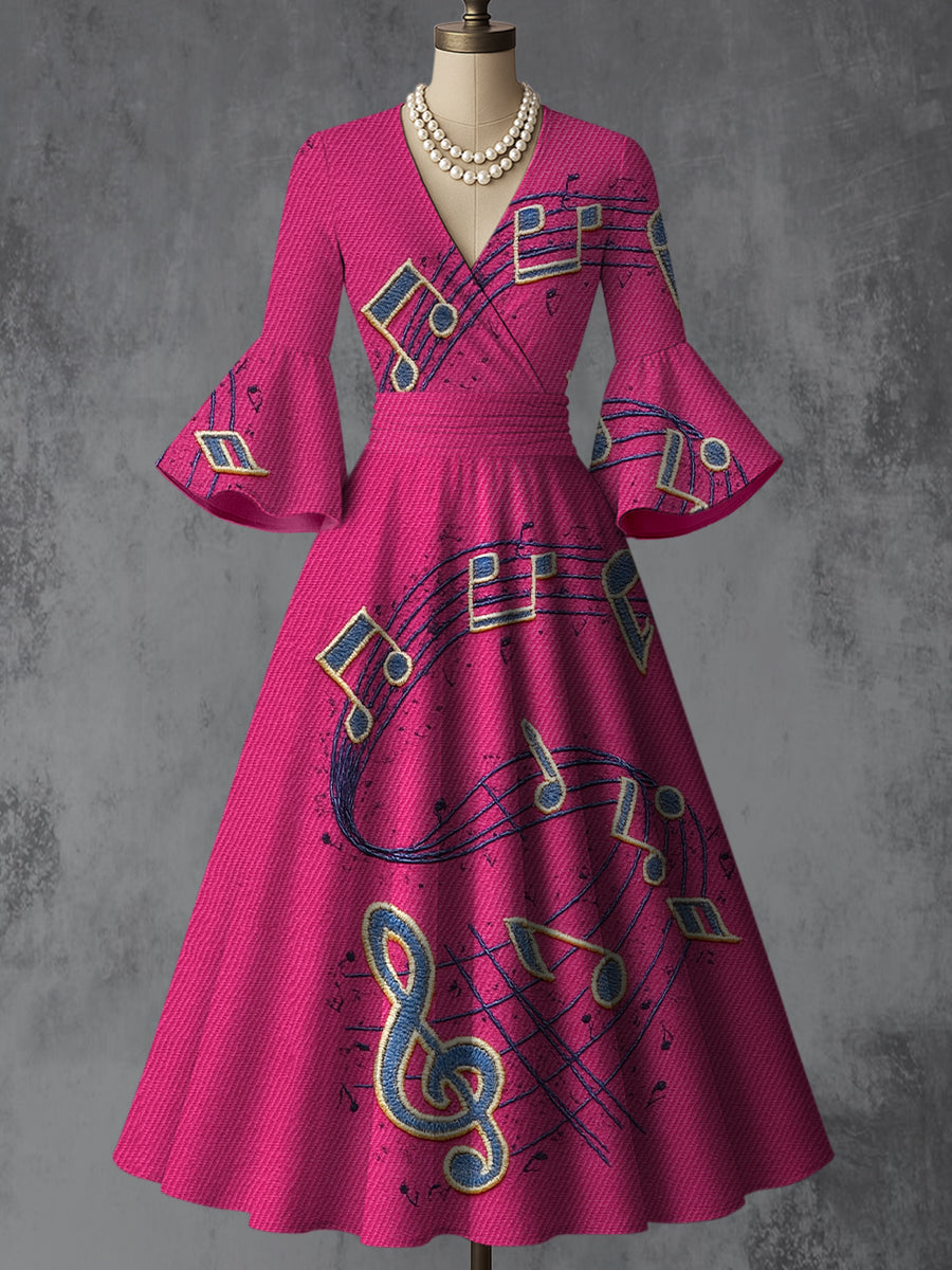 Retro High-Pitched Notes Art Printed V-Neck Vintage Chic Pleated Waist Flare Sleeve Midi Dress