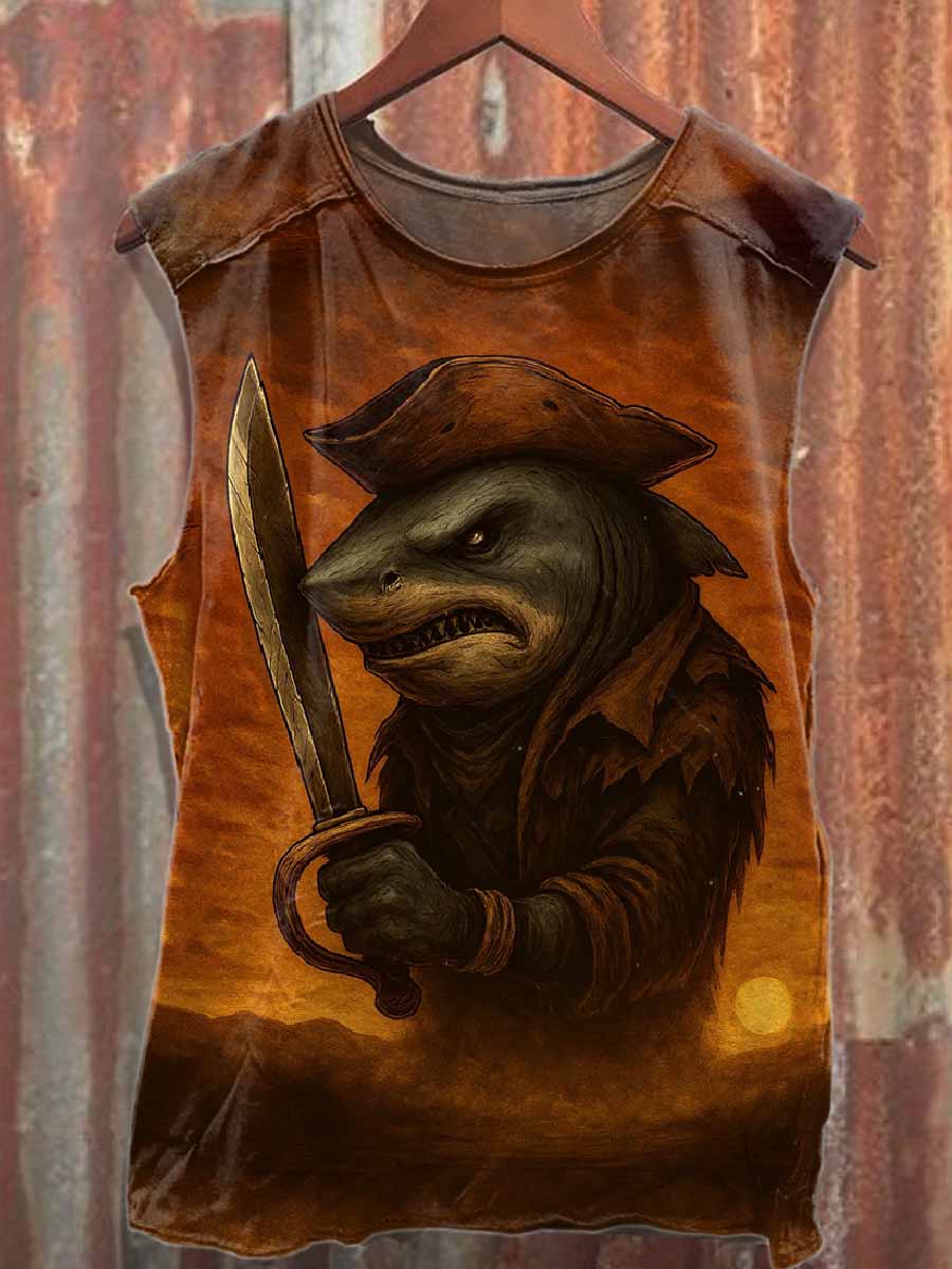 Retro Western Shark Print Casual Loose Cotton Tank Top